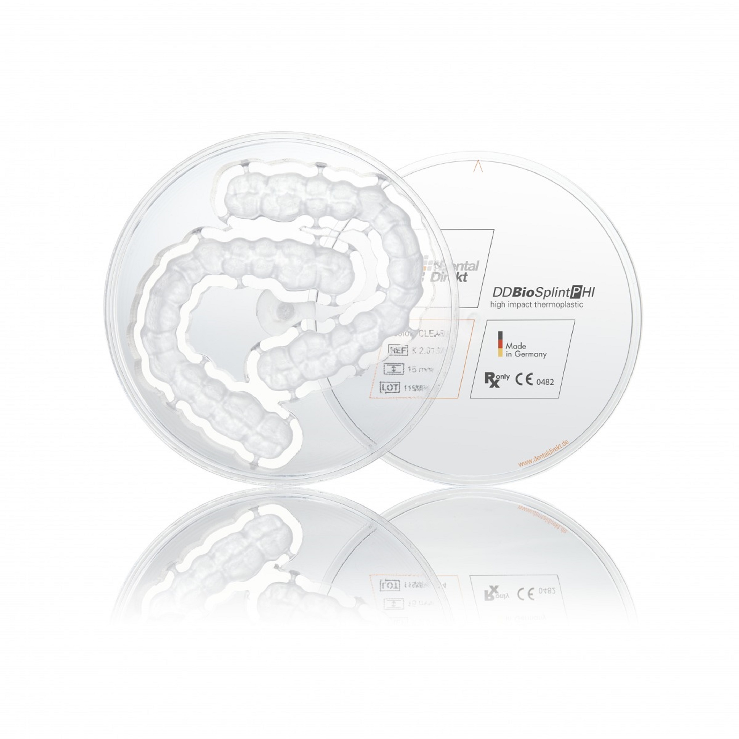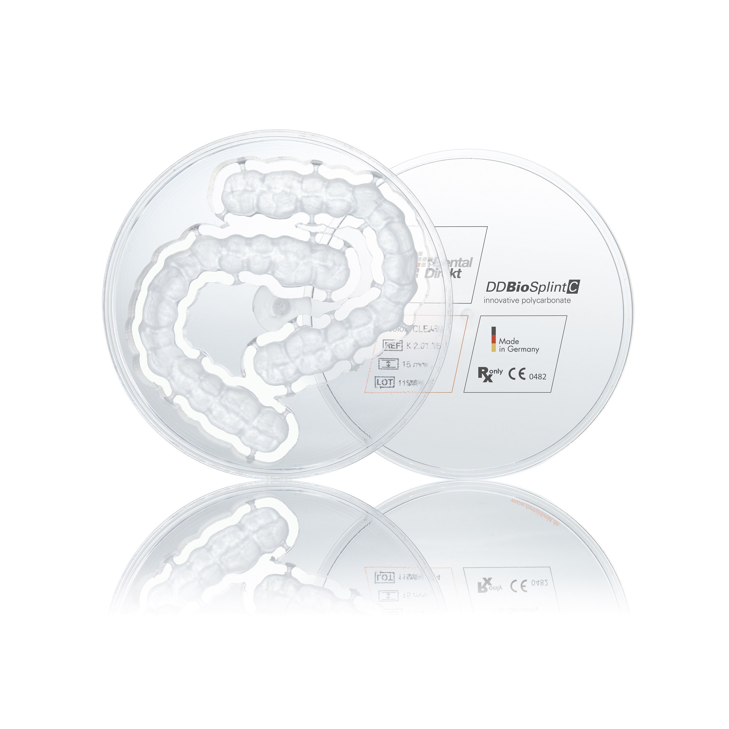 DD Bio Splint C er medisinsk polykarbonat basert på kryssbundet polymer. Dette materialet er utviklet spesielt til produksjon av bittskinner som skal tåle svært stor belastning over tid. DD Bio Splint C er industrielt fremstilt og er derfor helt fri for spenninger og deformasjoner, noe som gir perfekt passform.